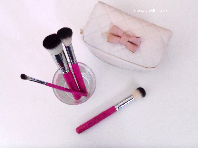 The currently has 3 brushes and is on the verge of launching their fourth. All of them are made with synthetic brushes and can be used with powder and cream products. Also, you can always choose between the Classic version with the black handle and the Girly version with the pink handle - which is the one I'll be showing today.